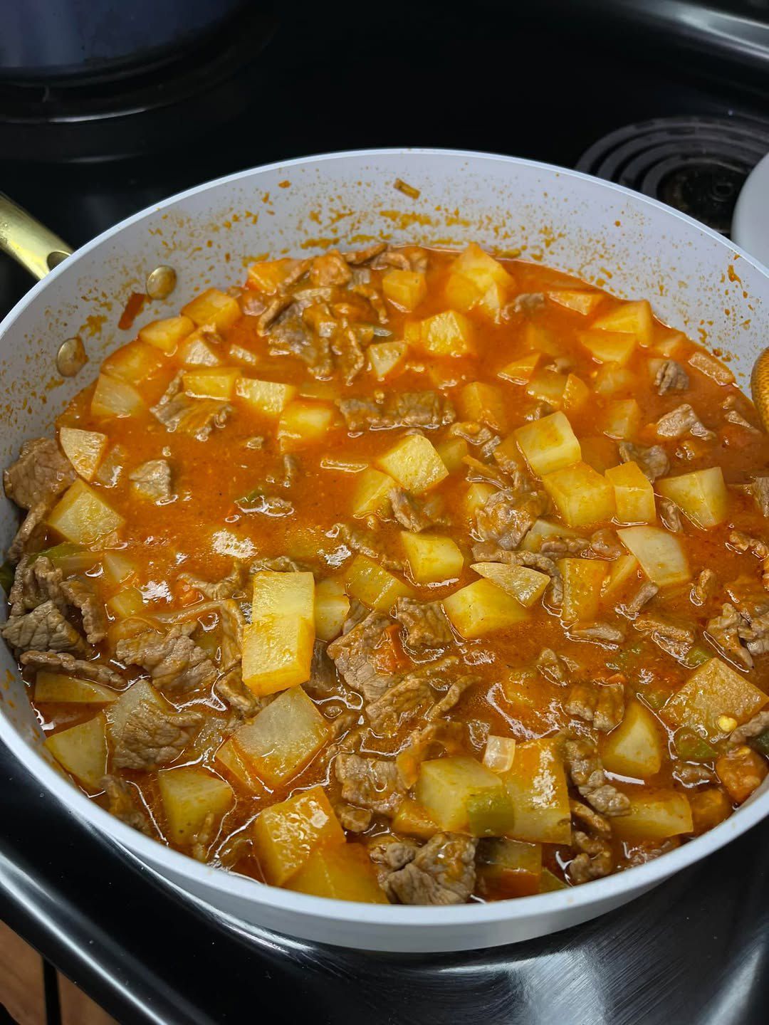 Once the beef is partially tender, add the potato chunks. Stir to combine, cover again, and continue cooking for another 20–30 minutes, or until the potatoes are soft and the beef is fully tender. The potatoes will absorb the delicious broth, making them incredibly flavorful.